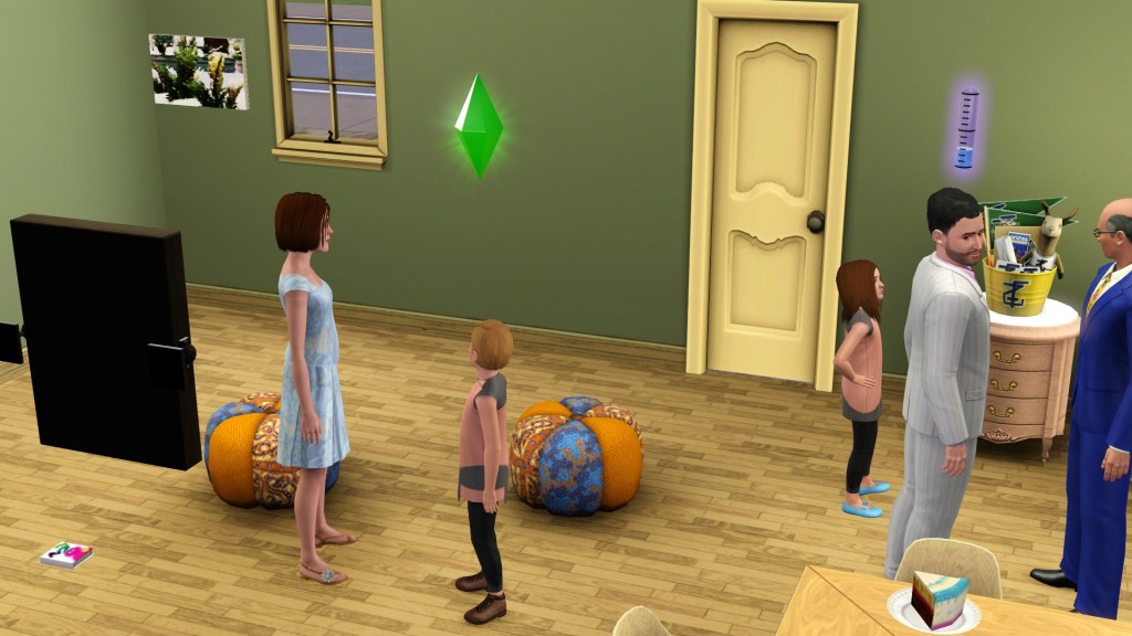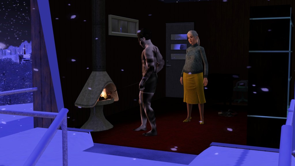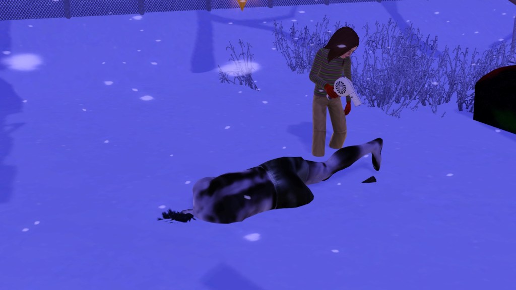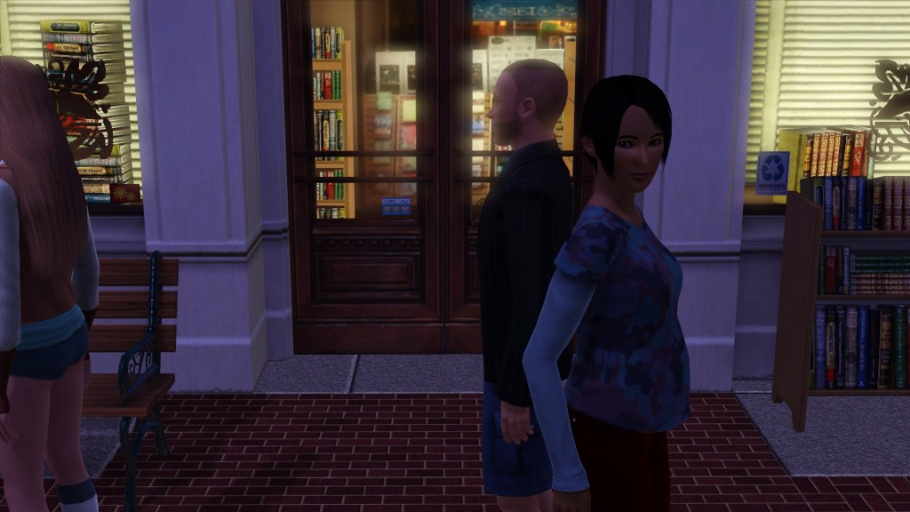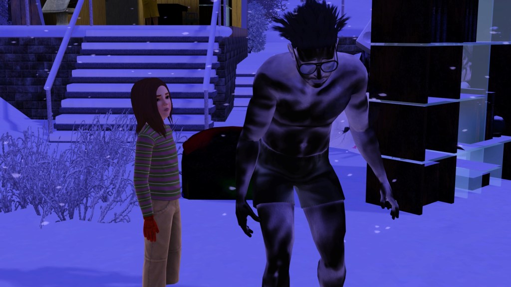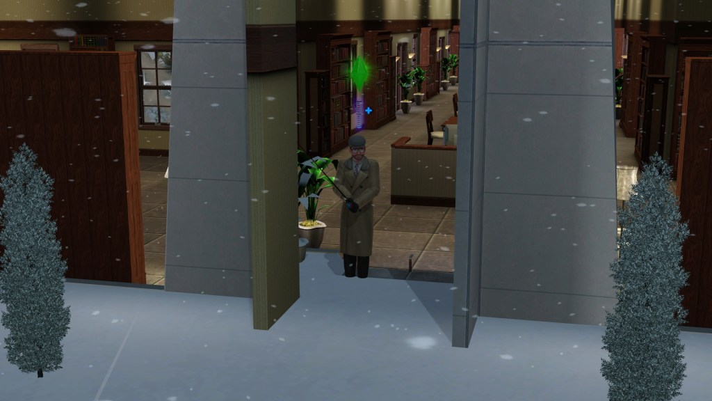 Mortimer Goth. In a previous game of mine, probably because he has Virtuoso as one of his traits, he was assigned the career path of Music, and had the aspiration of ‘Become a Hit Movie Composer’. He seemed to be dressed in a plausible style for that here. Random though. Maybe he’ll go into that career again.