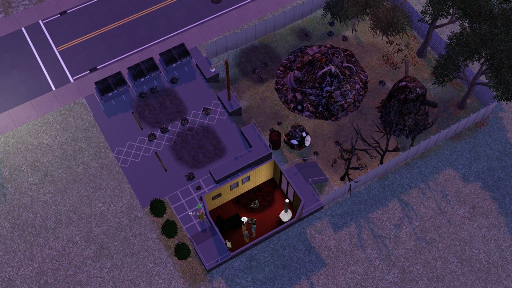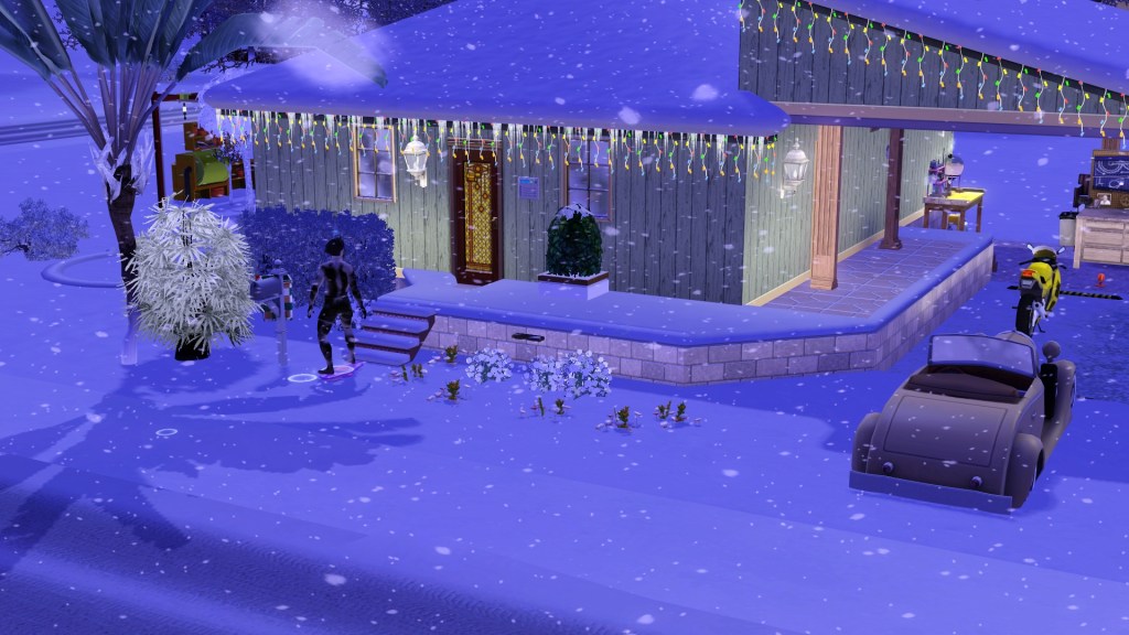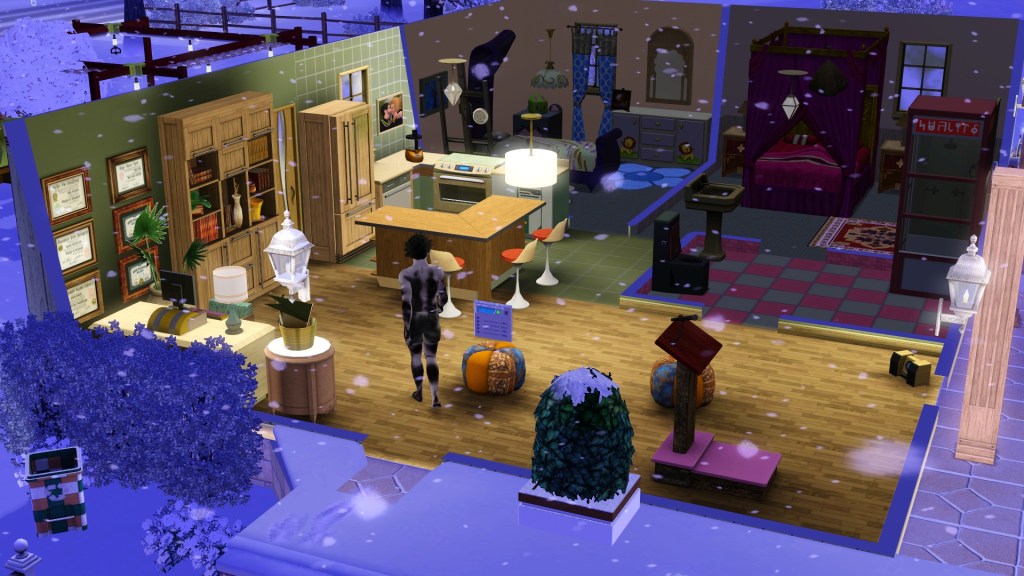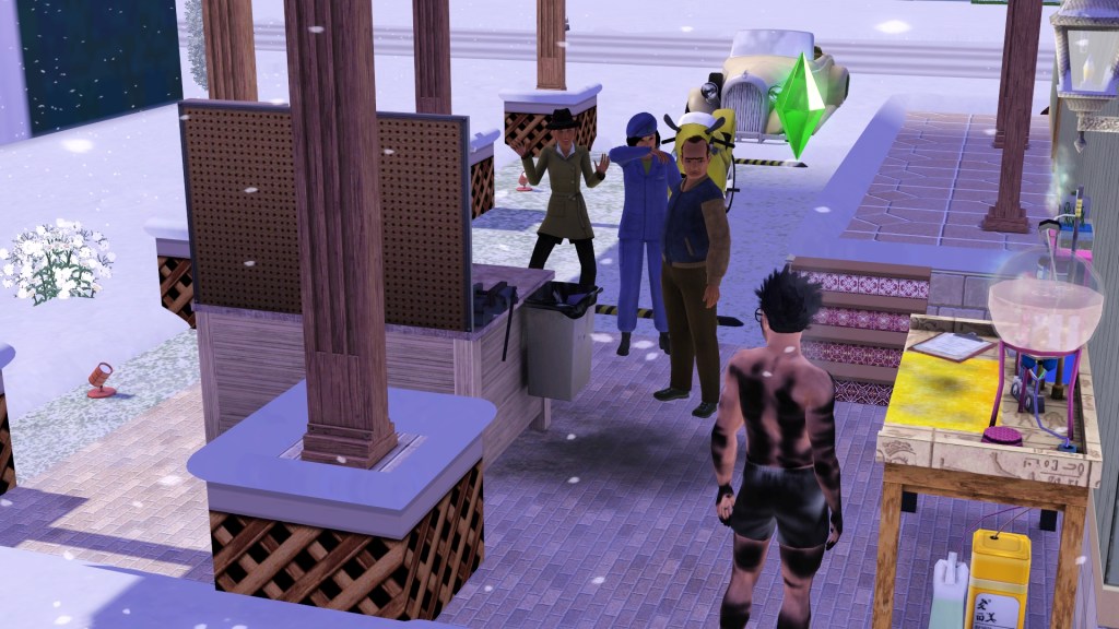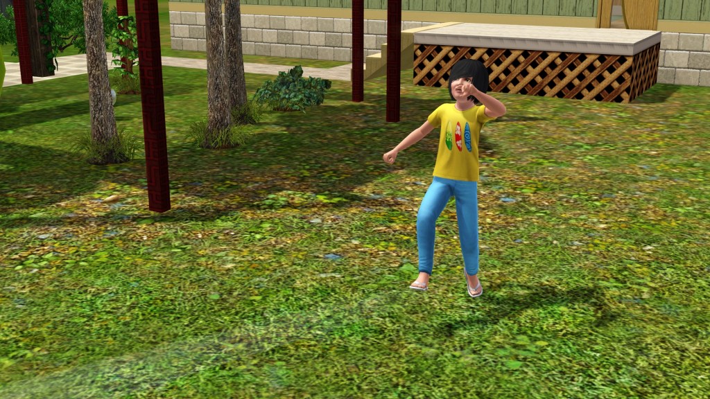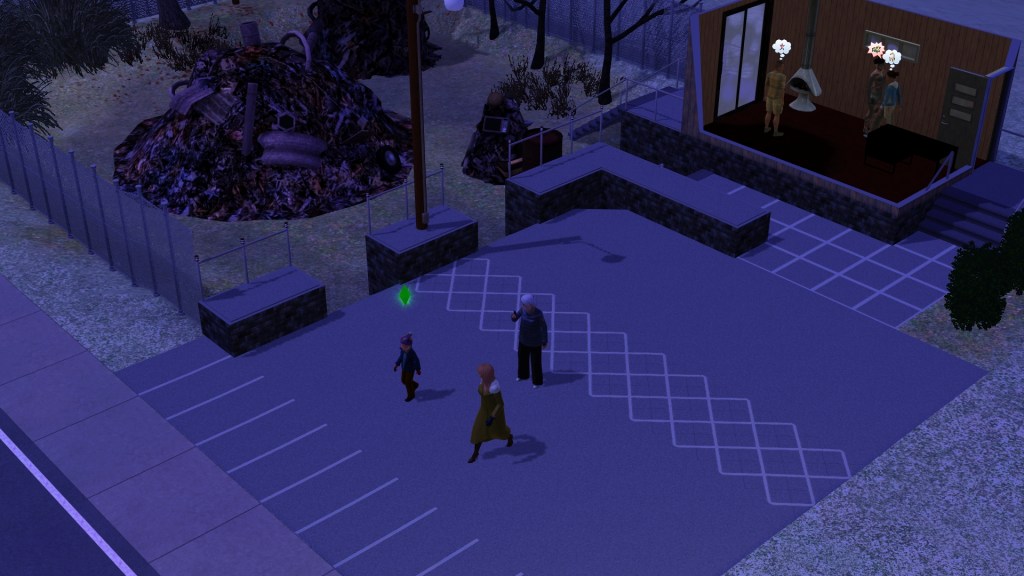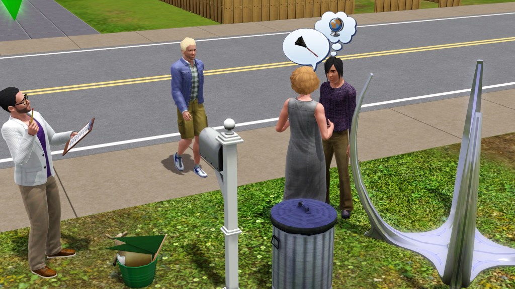 Mortimer Goth. In a previous game of mine, probably because he has Virtuoso as one of his traits, he was assigned the career path of Music, and had the aspiration of ‘Become a Hit Movie Composer’. He seemed to be dressed in a plausible style for that here. Random though. Maybe he’ll go into that career again.