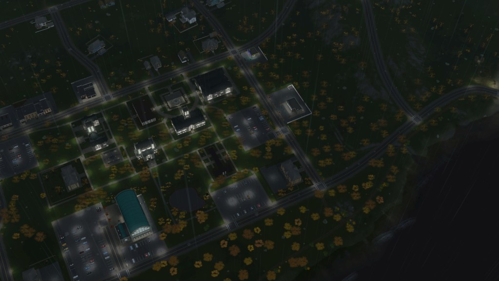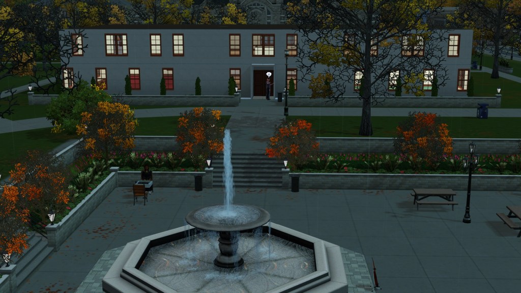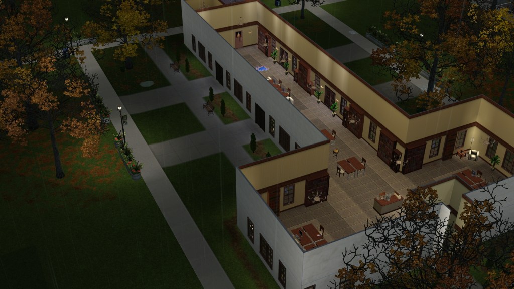 My limited laptop had trouble coping with the bottleneck of students rushing to get in the Connor’s Building lecture and the library. A mod for allowing access to the other doors was used, which fixed that, but it removed the cosmetic outer stone and shape of the buildings, and so it looked odd like it does below. Uncomfortable.