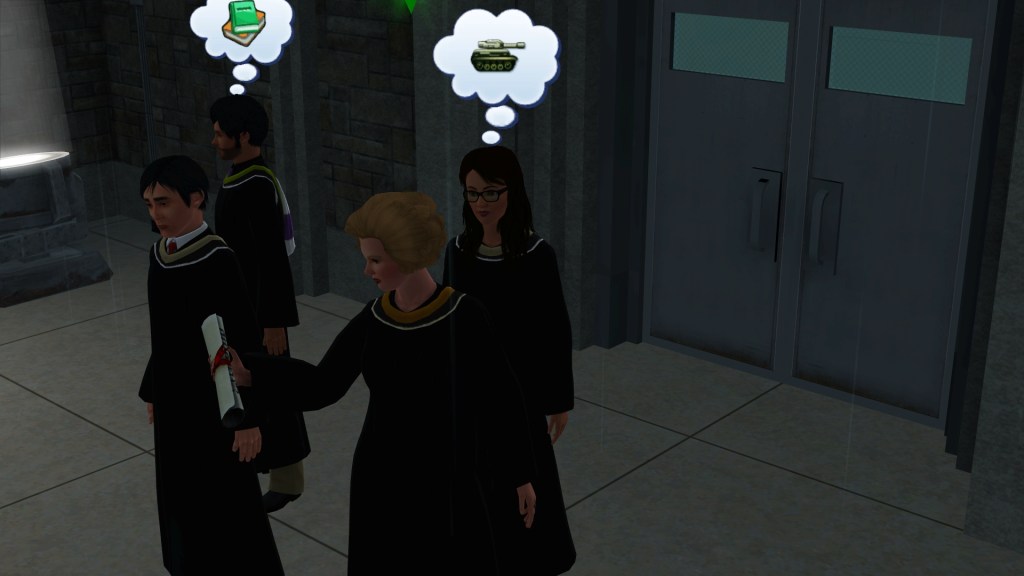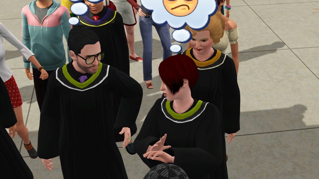 Again Dardanus graduated by nightfall, a result of the action time taking up longer sim time than normal because of the limited framerate. While Dardanus had picked Genius as his bonus graduation trait on his first degree to help with his second degree of Science, he changed it to Workaholic on the second graduation to help with his earnings at home and tolerance for working hard, and studying hard on his final degree which was to be Physical Education and he already has an Athletic trait for its skill set.