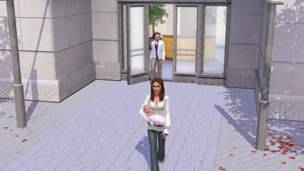 Besides, she didn’t have the car, Dardanus did. He tried calling the hospital for her, from where he was … at home. The game however organised a taxi for them both which they met up and got into and then went to the hospital together. The baby waited until they were in the hospital to be born. A girl named Dar. Randomly generated by the game, or was it? Seems like she was half named after Dardanus.