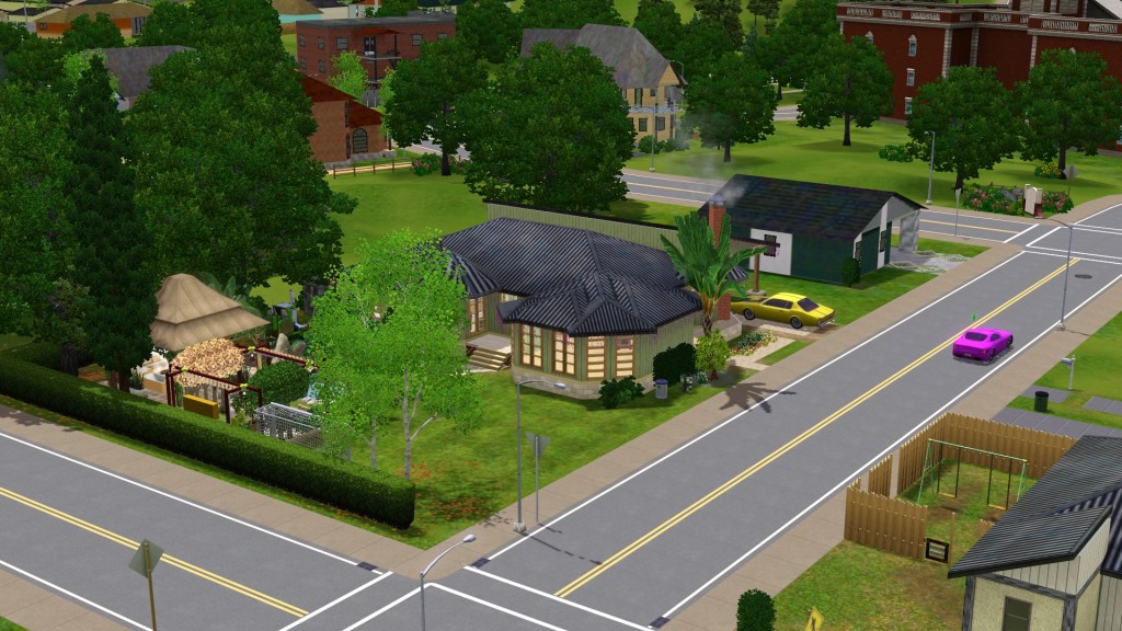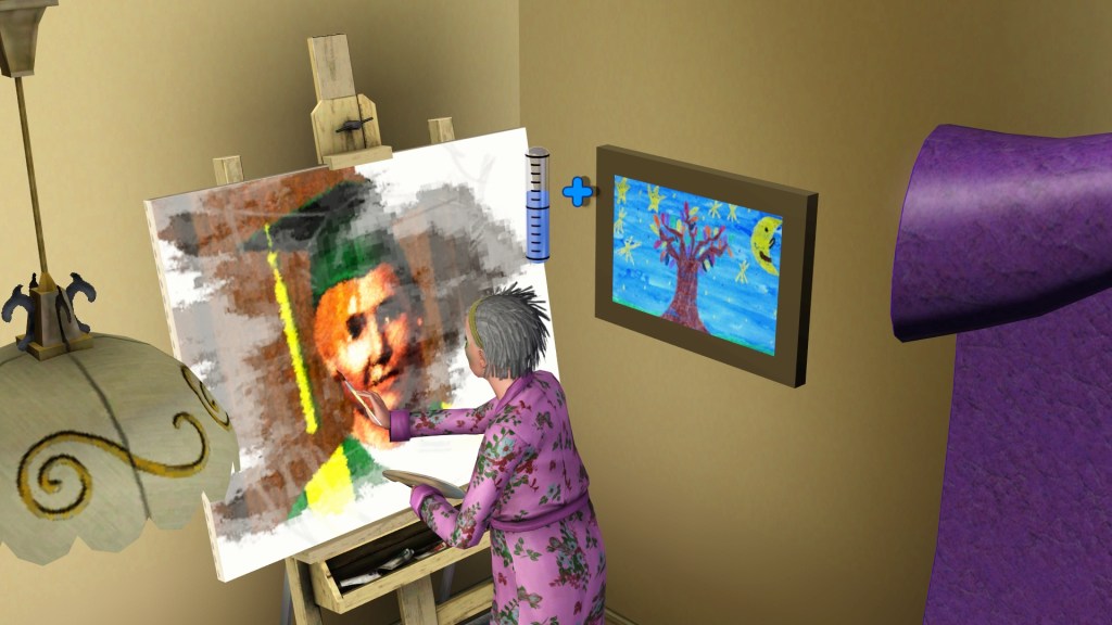 Homer graduated and came home from the Dribbledine Sports Academy boarding school, high school in the middle of the night. His dad Dardanus played some Foosball with him right after he got in the door. Homer hadn’t seen it yet because they bought it and extended that area while he was away. With some of the sims’ games it can be seen how it progresses and who is winning. I haven’t paid attention to Foosball yet. Its handy for fun and talking at the same time, and asking others to join. They seem to talk across the room to other talk-able activities too, building relationships. Homer told Dardanus about the Trampolining skill he gained at the academy. Dardanus told Homer who was still single in town. None of the girls from high school.